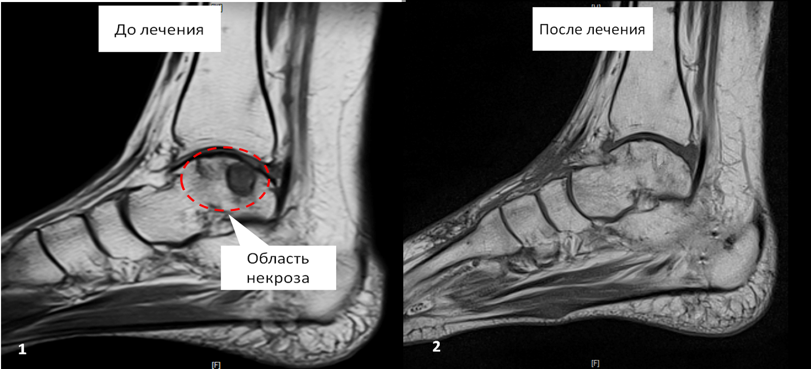 У пациентки был диагностирован аваскулярный некроз таранной кости (снимок 1). Консультировалась в различных медучреждениях, в том числе и Германии. Пациентке предлагали выполнить операцию по удалению мертвого участка кости и артродезирование (замыкание) голеностопного сустава, после которой никаких движений в голеностопном суставе у пациентки не было бы.