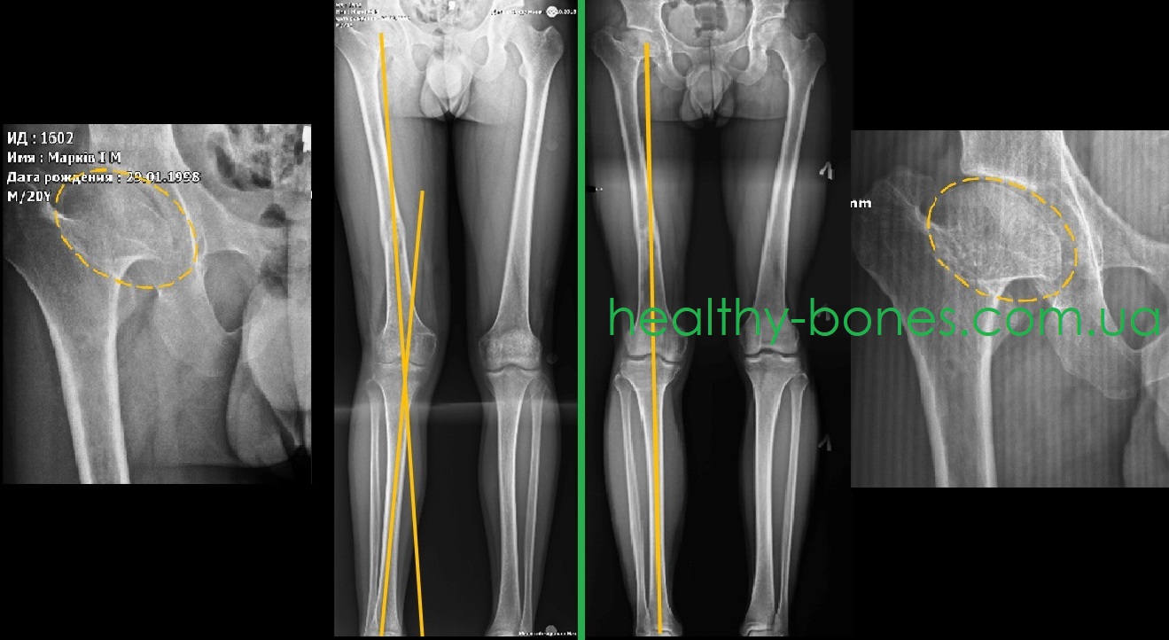 Пациент обратился к нам с жалобами на боли в области правого тазобедренного сустава и выраженную хромоту на правую ногу. В анамнезе у пациента — дисплазия правого тазобедренного сустава. В 18-ти летнем возрасте ему было предложено выполнить протезирование правого тазобедренного сустава. Но в день, когда была запланирована операция, врач порекомендовал не делать замену сустава, а поискать альтернативные способы лечения (рекомендация достойная уважения). При обследовании нами было выявлено: 1) значительное укорочение шейки правой бедренной кости с грибовидной деформацией головки, шеечно-диафизарный угол в пределах 130°; укорочение правой нижней конечности до 5 см; вальгусная деформация голени.