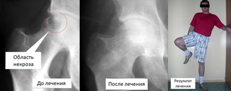 Разработанная нами технология с использованием клеточных технологий позволяет восстановить некротизированый (погибший) участок кости и сохранить собственную головку бедренной кости. По данной технологии было проведено лечение 25 пациентов. Впервые такая операция была выполнена 14 лет назад. Пациент, которому выполнена данная операция продолжает пользоваться своим тазобедренным суставом и не нуждается в замене сустава на искусственный (см. рисунки).