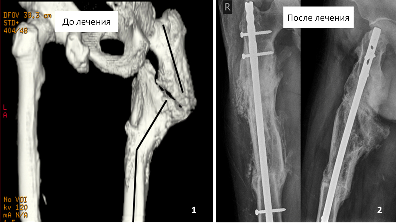 Пациент 28 лет травму получил в результате ДТП. Лечился в травматологическом отделении по месту жительства. В результате проводимого лечения перелом сросся с угловой деформацией левой бедренной кости и укорочением на 5 см (см. фото 1). В течение 3 лет вынужден был передвигаться при помощи одного костыля. Консультировался в 3-х лечебных учреждениях, где ему рекомендовали привыкать к деформации бедра, а укорочение ноги компенсировать при помощи увеличения толщины подошвы на обуви.