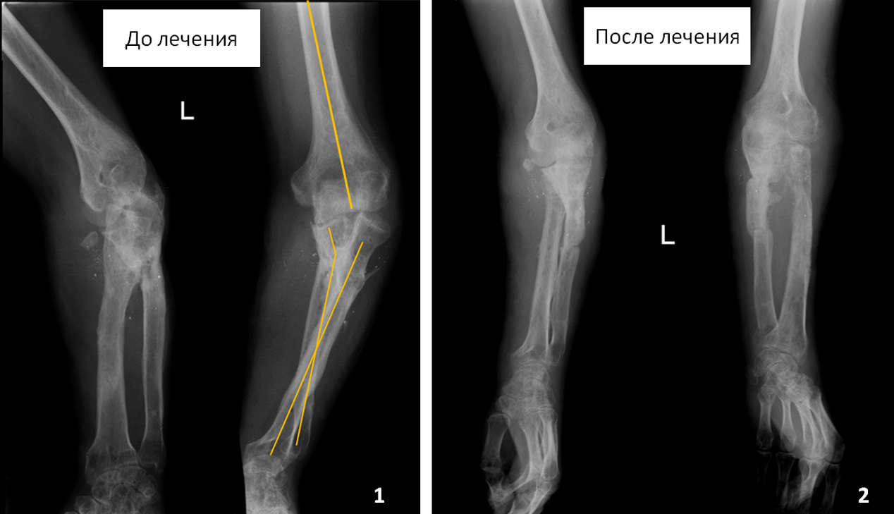 За рекомендацією друзів звернувся до нас за допомогою. Ми провели дві реконструктивно-відновлювальних операції, в результаті яких остеомієлітичний процес був ліквідований і вісь передпліччя була максимально можливо відновлена.