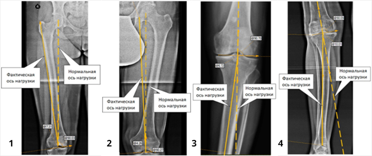 Деформації кісток нижніх кінцівок поділяють на варусні (1 і 3 фото) і вальгусні (2 і 4 фото). Ці деформації часто поєднуються з ротаційними деформаціями, коли вісь сегмента кінцівки додатково повертається або всередину, або назовні. Тоді говорять про складні деформації.